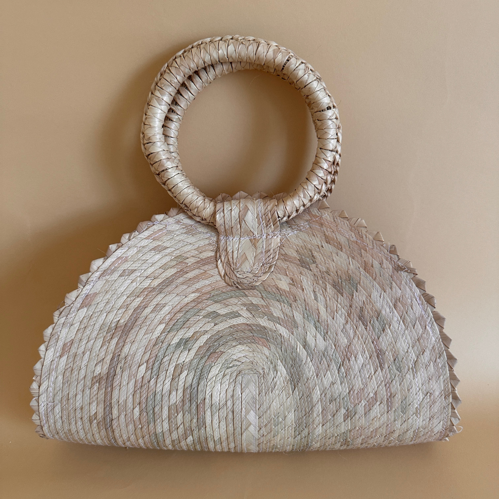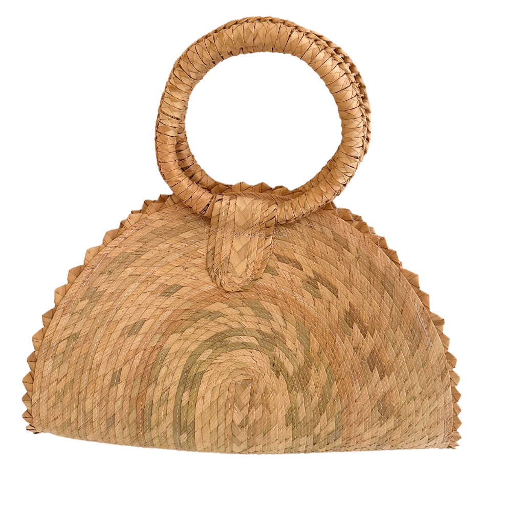 Bolso tipo canasta tejido a mano con palma natural, con asa circular tejida para llevarlo cómodamente. Sus dimensiones de 35 cm de ancho × 25 cm de alto × 10 cm de profundidad lo hacen perfecto para un look boho y funcional en salidas diarias o eventos especiales.
