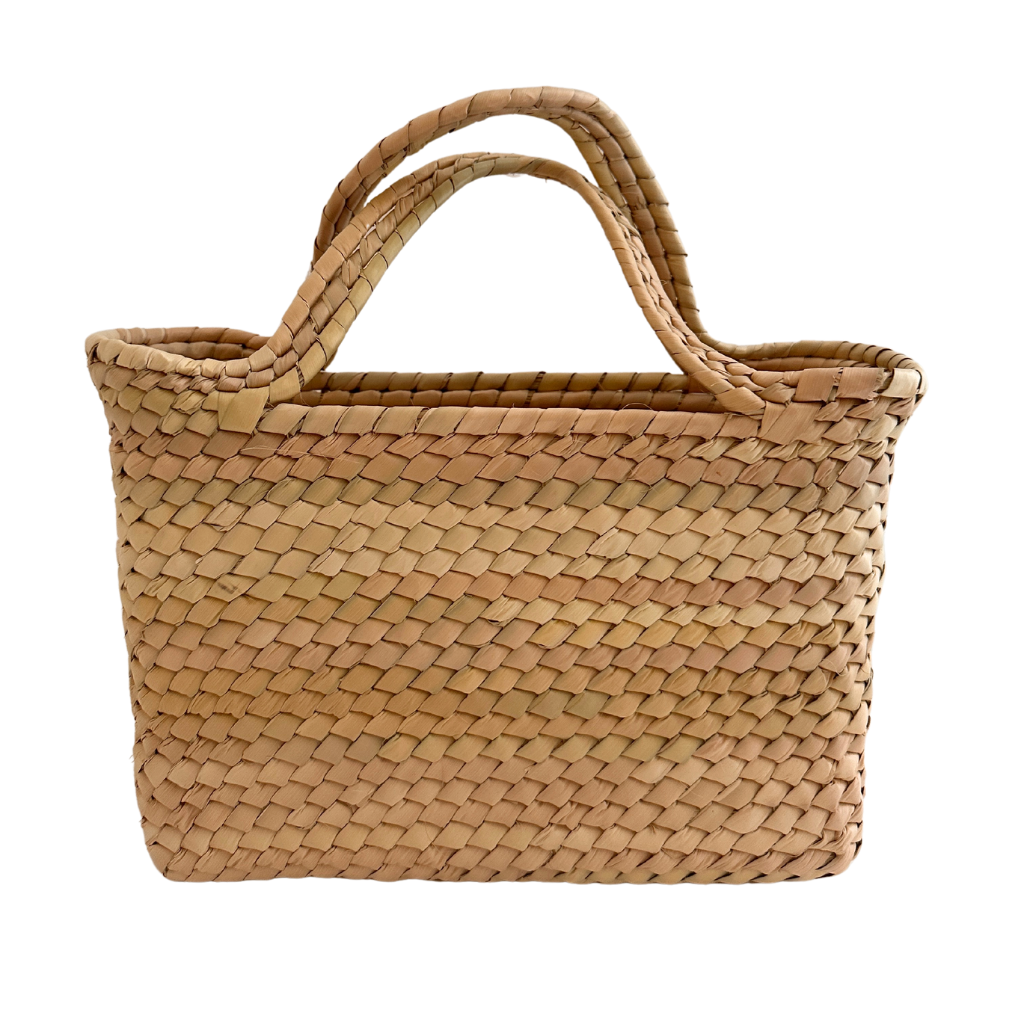 Bolso tipo canasto tejido a mano con palma natural, perfecto para llevar a la playa o usar como pieza decorativa. Con sus asas cómodas y diseño boho, también funciona como centro de mesa o regalo especial.