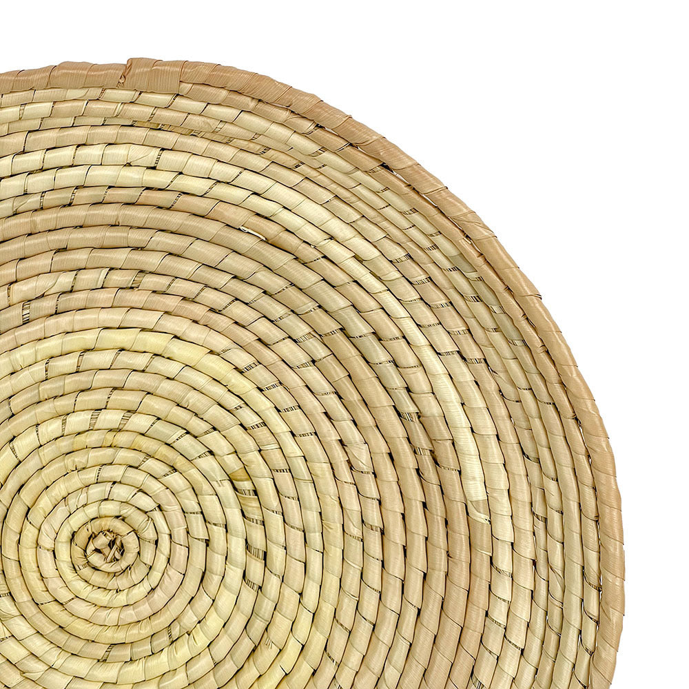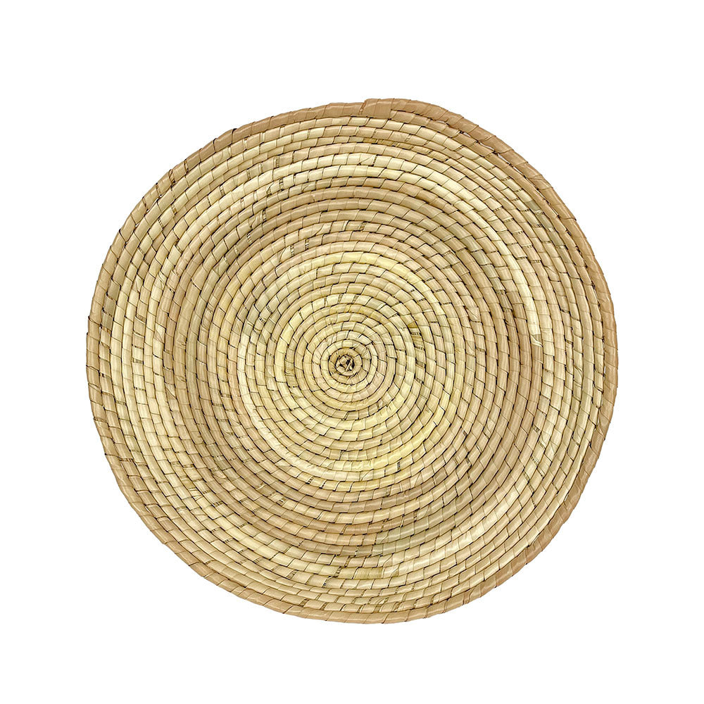 Plato decorativo tejido a mano con palma natural. Ideal para dar un toque bohemio y artesanal a cualquier pared, creando un ambiente cálido y acogedor.
