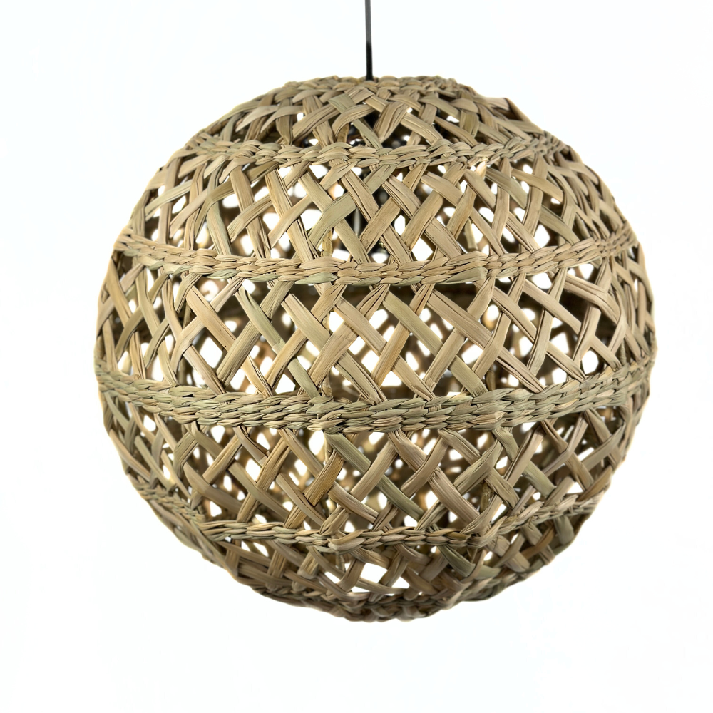 Pantalla de lámpara tejida a mano con tule natural. El tejido combina patrones en cruz y cadena, creando un diseño único que proporciona una iluminación cálida y acogedora, ideal para espacios interiores y áreas techadas.