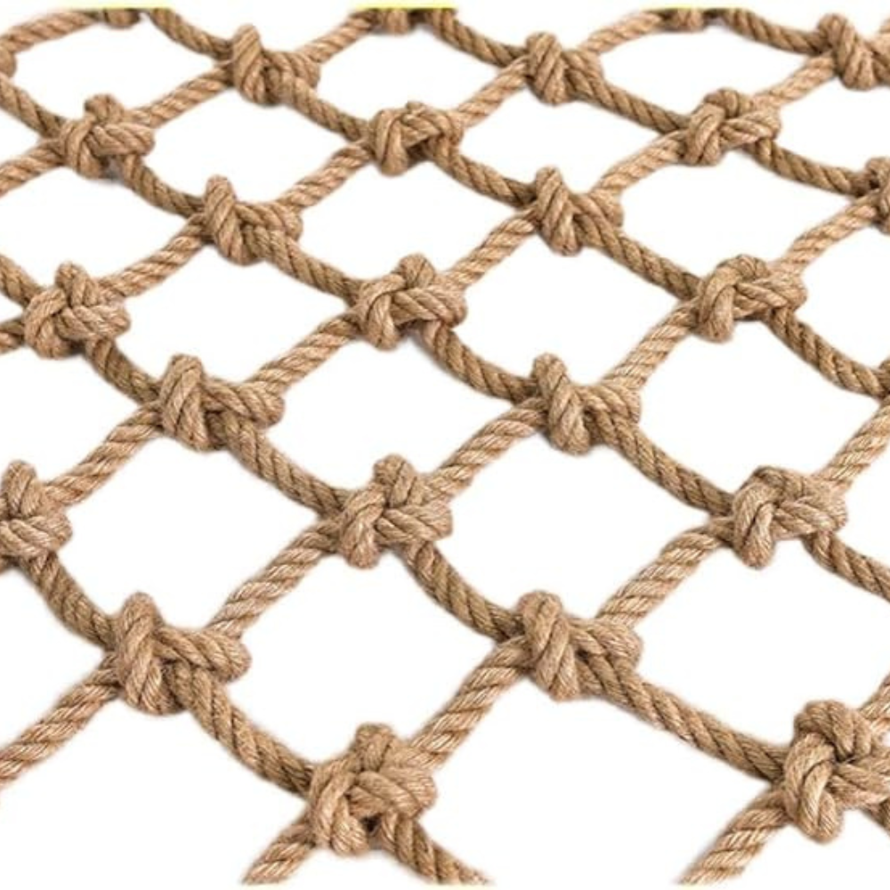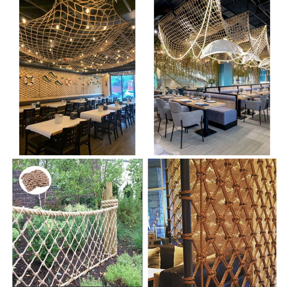 Red decorativa en cuerda de yute ideal para interiores de restaurantes, cafés y espacios creativos. Aporta textura natural y permite componer cielos rasos ondulados, muros acentuados o divisiones ligeras entre áreas.