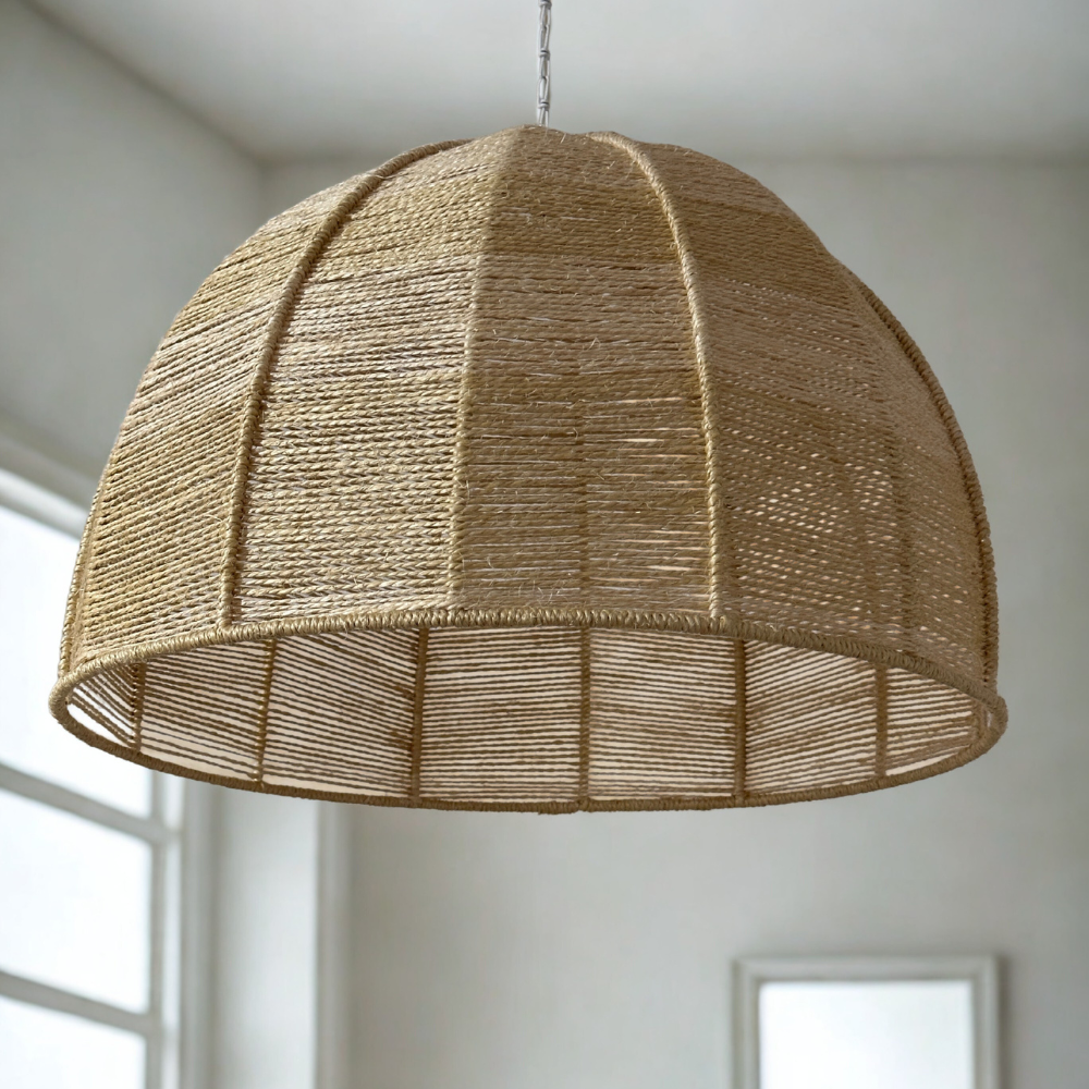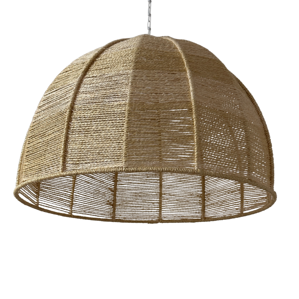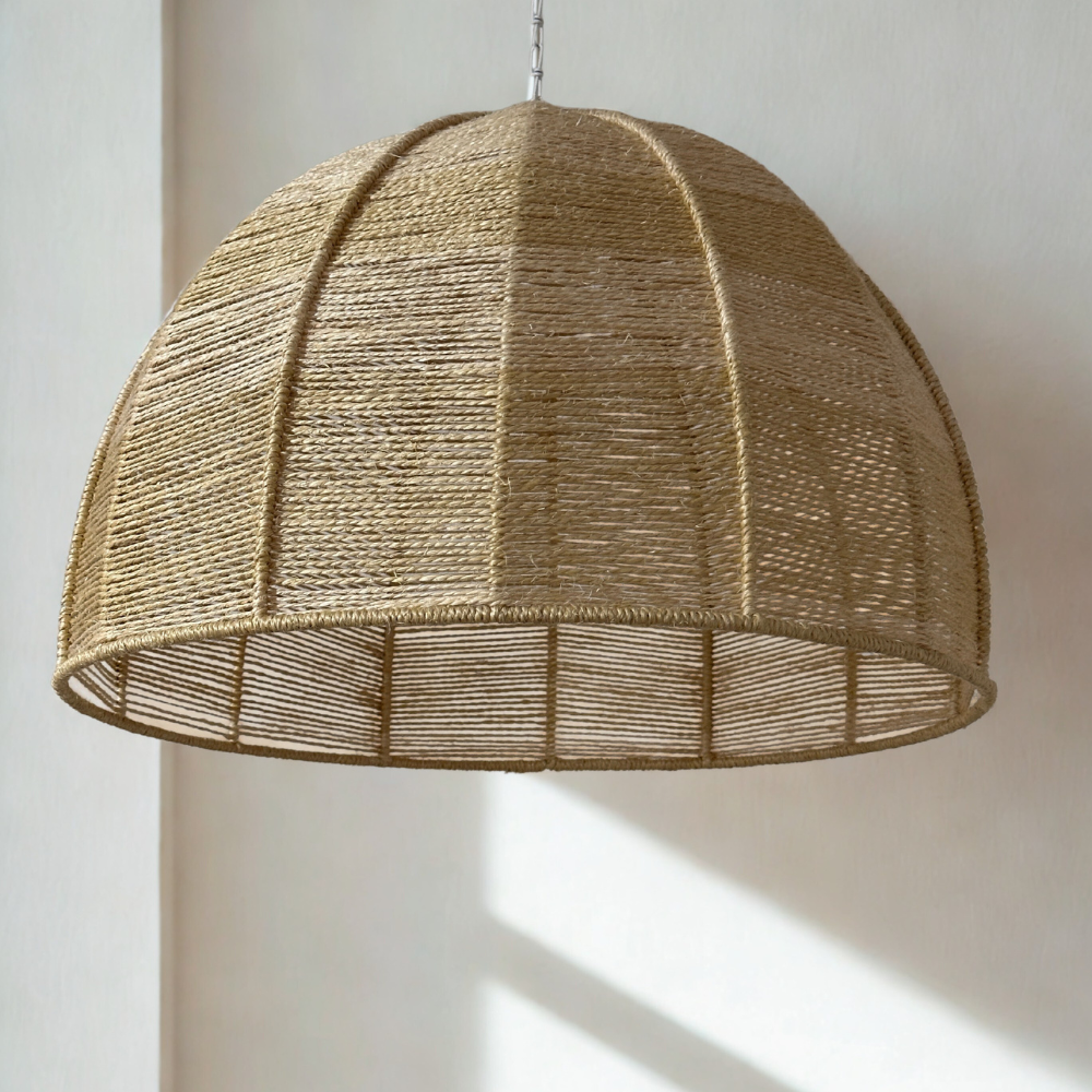 Pantalla artesanal tejida en henequén sobre estructura de metal. Difunde una luz cálida y uniforme, perfecta para crear ambientes serenos en casa o proyectos comerciales.